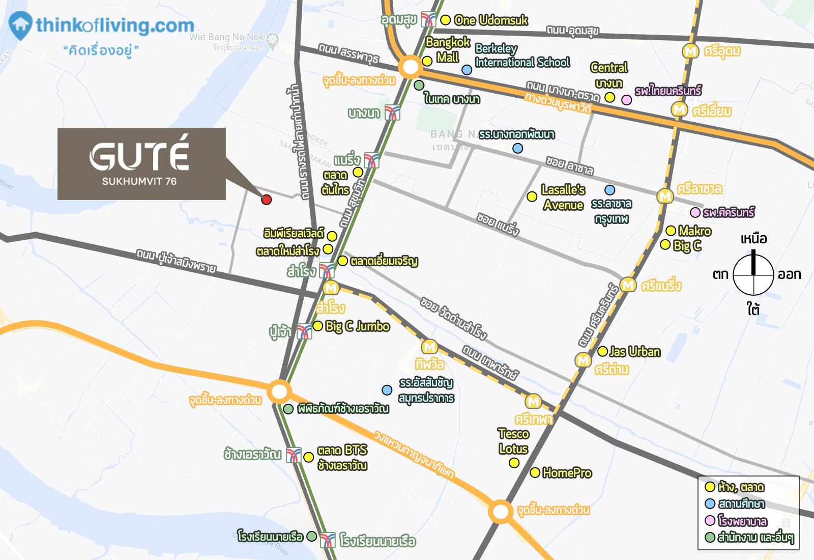 แผนที่แสดงระยะทางของจุดสำคัญๆ ที่สามารถเดินทางจากโครงการ GUTE’ Sukhumvit 76 ได้นะครับ ไม่ว่าจะเป็นการไปเชื่อมต่อถนนใหญ่ได้ 2 สาย และยังสามารถไปขึ้นรถไฟฟ้าได้อีก 2 สายด้วย