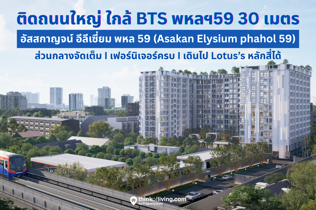 ทำเลแถว BTS สถานีพหลโยธิน59 มีคอนโดมิเนียมขึ้นใหม่ค่อนข้างเยอะเลยค่ะ ครั้งนี้เราพามาดูโครงการใหม่ทำเลดีที่ใกล้รถไฟฟ้าแล้วยังเดินไปหาของกินได้ง่าย กับโครงการ Asakan Elysium phahol59 (อัสสกาญจน์ อีลีเซี่ยม พหล59) อยู่ห่างจากทางขึ้นสถานีพหลฯ59 เพียง 30 เมตร ให้เฟอร์นิเจอร์ครบ และทำราคาออกมาได้น่าสนใจทีเดียว เริ่มต้น 2.19 ล้านบาท* โครงการนี้จะมีจุดเด่นอะไรบ้างเราไปชมกันเลยค่ะ