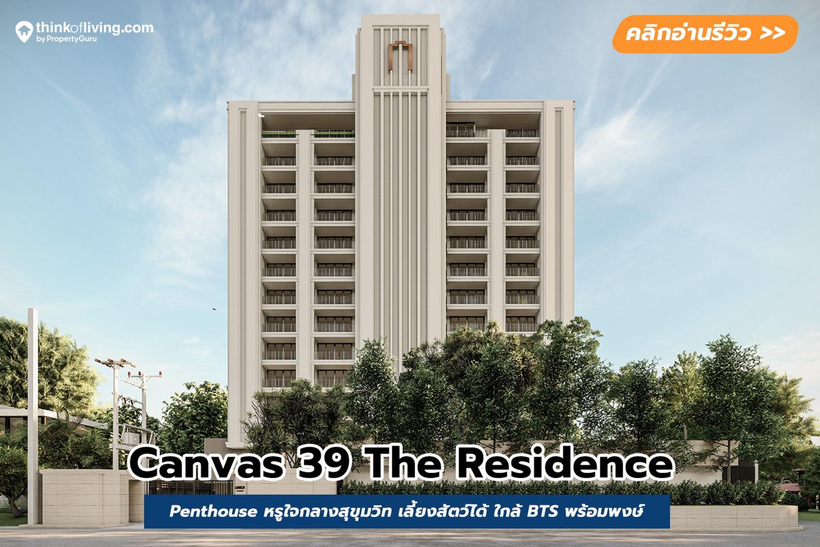 Canvas 39 The Residence (แคนวาส 39 เดอะ เรสซิเดนซ์) เป็นคอนโด Mid Rise 14 ชั้น บนทำเลใจกลางพร้อมพงษ์ มาพร้อมรูปแบบห้อง Penthose ฟังก์ชัน 3 ห้องนอน 4 ห้องน้ำ ได้พื้นที่ใช้สอยใหญ่ถึง 234 ตร.ม. จึงทำให้จำนวนยูนิตต่อชั้นมีเพียง 2 ห้องเท่านั้น เหมาะกับคนที่ชอบความเป็นส่วนตัวสูง โดยโครงการตั้งอยู่ในซอยพร้อมจิตร บนเนื้อที่ประมาณ 1 ไร่ ห้องพักอาศัยทั้งหมด 23 ยูนิต ได้พื้นที่จอดรถ 222% หรือ 51 คัน รองรับการใช้งานของลูกบ้านได้แบบสบายๆ การออกแบบของโครงการมาในสไตล์ Neo Classic ได้กลิ่นอายเรียบหรู ด้วยโทนสีขาว ครีม น้ำตาล แต่ยังให้ความรู้สึกอบอุ่น น่าอยู่อาศัยด้วยการแซมสีเขียวจากธรรมชาติ โดยจุดเด่นของโครงการนี้ นอกจากจะเป็น Penthouse ไซส์ใหญ่ ยังเป็นคอนโดที่สามารถเลี้ยงสัตว์ได้อีกด้วย เวลามีน้องๆออกมานั่งต้อนรับ ก็ให้ความรู้สึกเหมือนได้กลับบ้านจริงๆนะคะ