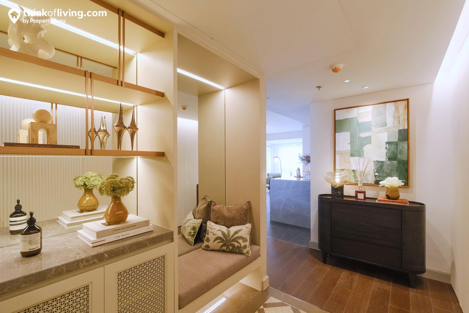 เข้ามาในห้องตัวอย่าง ด้านหน้าจะเป็นโถงต้อนรับมีมุมให้ Built – in เป็นตู้เก็บของ หรือที่นั่งพักเวลาถอด – ใส่รองเท้าได้เป็นสัดส่วน ฝั่งตรงข้ามเป็นห้องน้ำแบบ Powder Room และห้องเก็บของไซส์กำลังดี จะใช้เก็บอุปกรณ์ของใช้ในบ้าน หรือทำเป็นห้องเก็บรองเท้าแยกไปเลยก็ได้