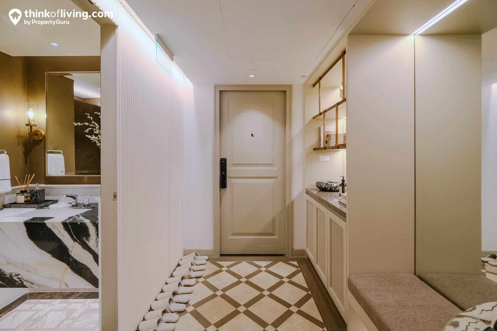 ห้องมาตรฐานจะได้วัสดุกรุผนังเหมือนห้องตัวอย่างตามภาพ เวลาที่ปิดประตูไว้จะให้ความรู้สึกกลมกลืนไปกับผนังห้อง ส่วนฟังก์ชันที่ซ่อนอยู่ด้านในจะเป็นห้องเก็บของ ที่สามารถ Built – in ทำเป็นห้องเก็บรองเท้าได้ และห้องน้ำแบบ Powder Room ที่ติดตั้งอุปกรณ์มาให้ครบ ทั้งอ่างล้างมือ และโถสุขภัณฑ์จาก TOTO ซึ่งเป็นแบรนด์สุขภัณฑ์ชั้นนำจากประเทศญี่ปุ่น