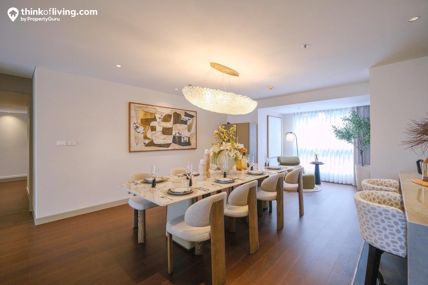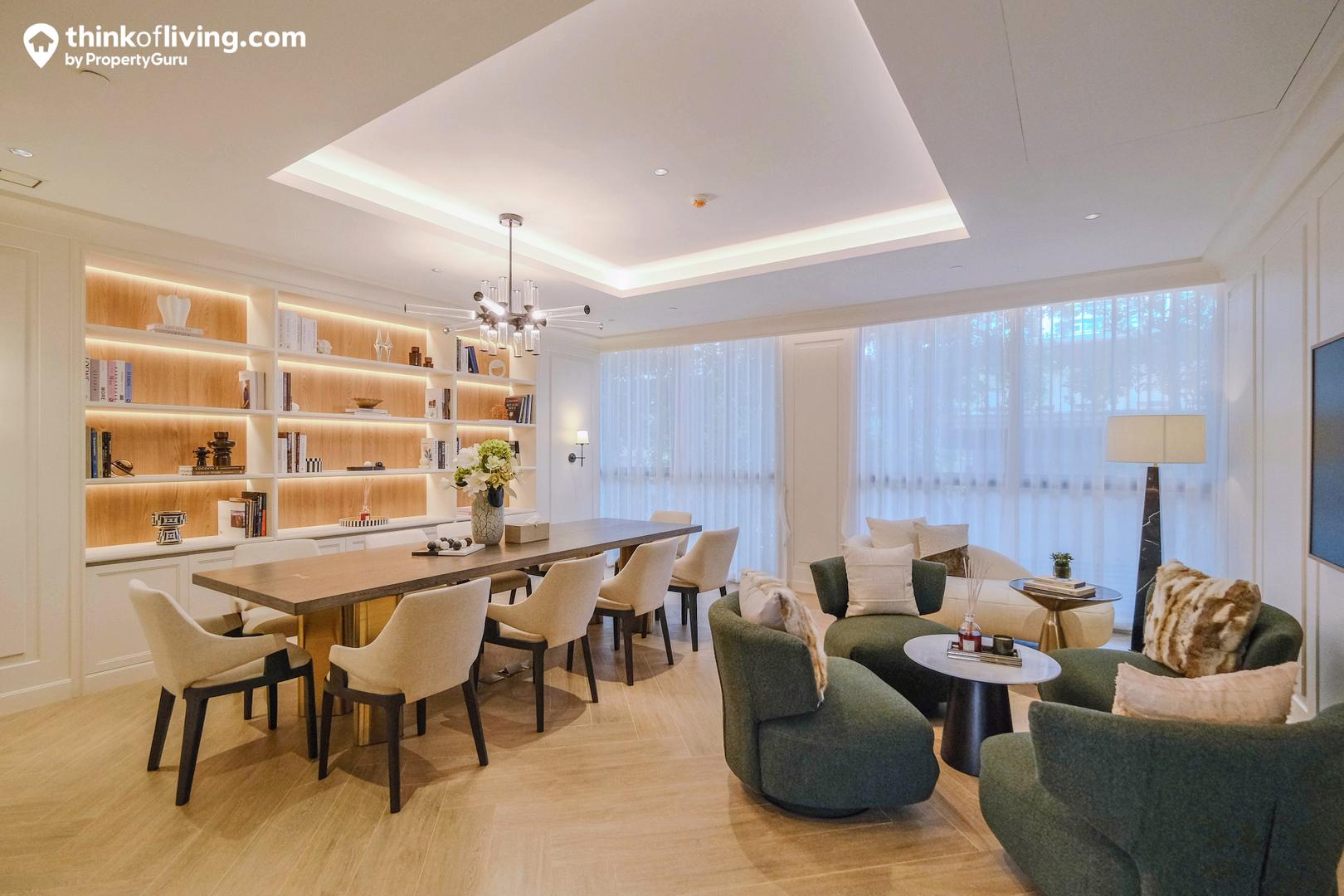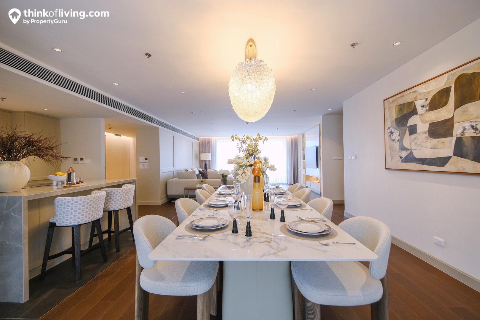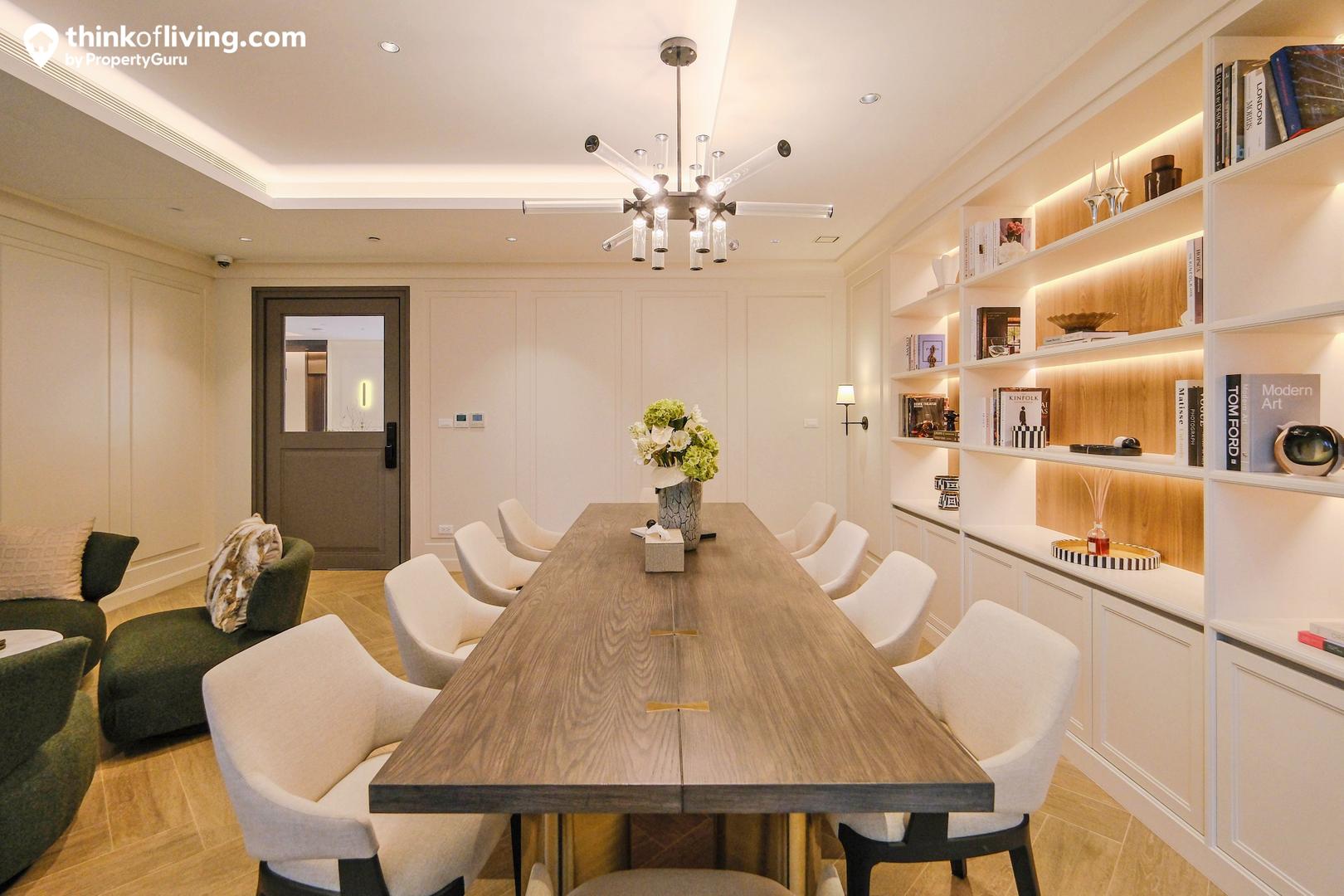ส่วนรับประทานอาหารได้พื้นที่ใช้สอยค่อนข้างกว้างเลย สามารถวางโต๊ะยาวพร้อมเก้าอี้ได้ 8 – 10 ที่นั่ง จะเป็นครอบครัวใหญ่หรือเจ้าของห้องที่ต้องการใช้พื้นที่รับแขกเยอะๆ ก็สามารถรองรับได้แบบสบายๆ ด้านข้างจัดเป็นมุม Pantry ไว้สำหรับเตรียมอาหารเบาๆ ยกเสิร์ฟได้สะดวก จากภาพด้านล่างจะเห็นเครื่องปรับอากาศของโครงการได้เป็น Cassette Type (ระบบ VRF)