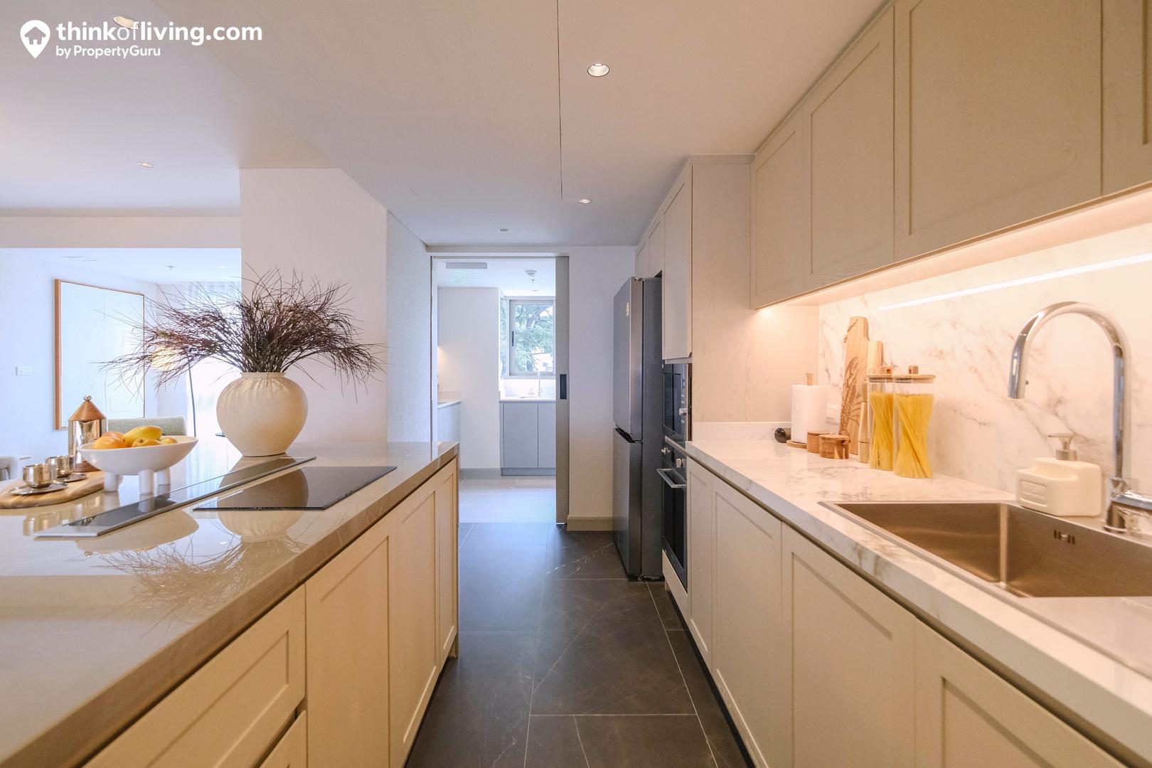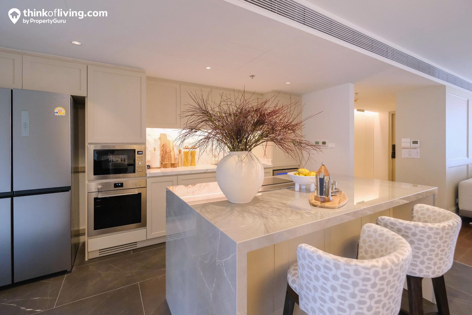 Island ที่โครงการติดตั้งมาให้ สามารถใช้เป็นพื้นที่ทำอาหารและเก็บของด้านล่างได้ด้วย โดยท็อปเคาน์เตอร์ได้เป็น Sintered Stone หรือ หินอ่อนเทียม แบบ Food Grade ที่นอกจากจะแข็งแรง ทนทาน ยังมั่นใจได้ว่าอาหารจะปลอดภัยจากสิ่งปนเปื้อน ส่วนเตาไฟฟ้าได้มาเป็นระบบ 2 หัว จากยี่ห้อ SMEG พร้อมเครื่องดูดควันอัตโนมัติแบบฝังเคาน์เตอร์ (ระบบหมุนเวียน) สามารถดึงขึ้นมาได้เมื่อต้องการใช้งาน ช่วยประหยัดพื้นที่ติดตั้ง เพิ่มความเรียบร้อย สวยงาม ด้านล่างเคาน์เตอร์ยังได้เป็นตู้เก็บของ มีทั้งบานเปิดและลิ้นชัก ด้านในมีถาดเก็บของติดตั้งมาให้เรียบร้อย