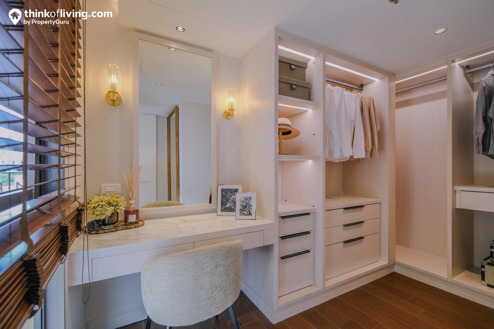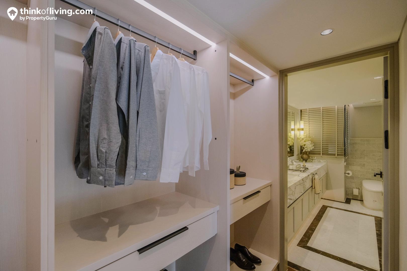 Walk – in Closet ได้มาขนาดใหญ่กว่าห้องที่แล้ว จัดเป็นตู้เสื้อผ้าสูงถึงฝ้าได้ทั้งสองฝั่ง มีทั้งราวแขวน , ลิ้นชัก และโต๊ะเครื่องแป้งมาให้ครบ หากเป็นห้องที่อยู่ด้านกัน 2 คน ก็สามารถแบ่งใช้งานได้สบายๆ