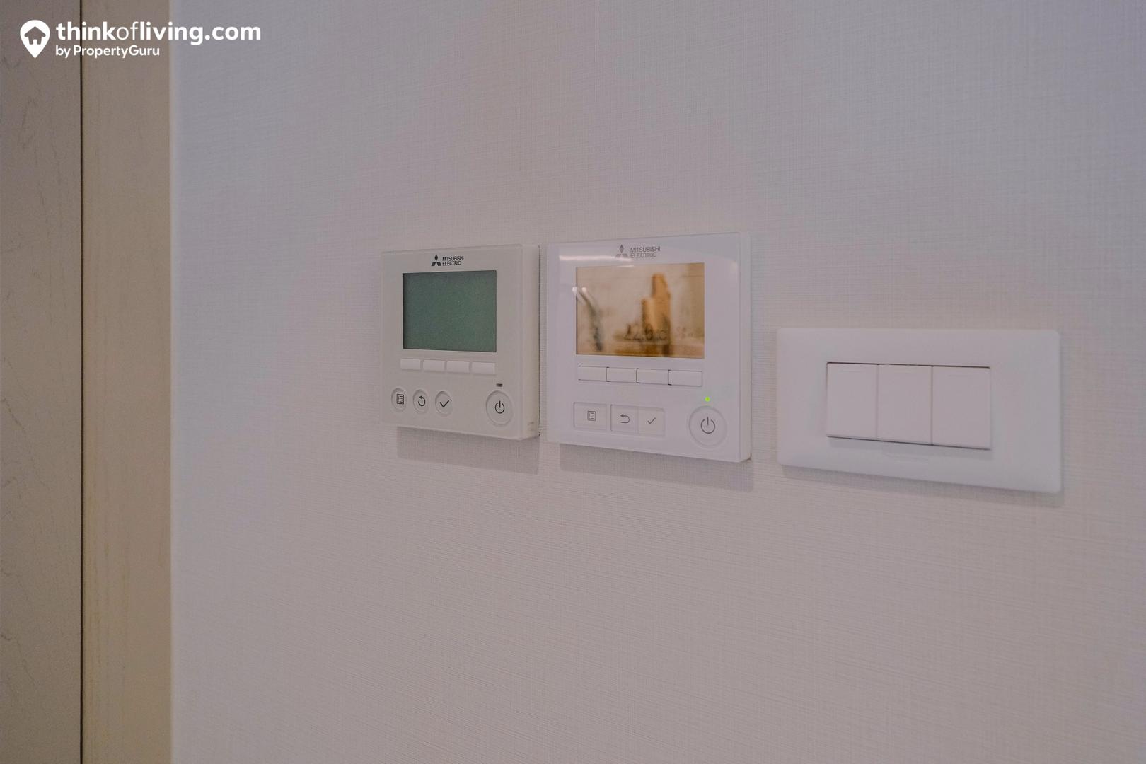 สวิตช์และปลั๊กไฟในห้องใช้ของยี่ห้อ Panasonic เครื่องปรับอากาศและระบบฟอกอากาศจาก MITSUBUSHI (ติดตั้งภายในส่วนนั่งเล่นและห้องนอน) สำหรับคนที่อยากติดตั้งระบบ Home Automation ก็สามารถซื้อมาติดเพิ่มเองได้นะคะ
