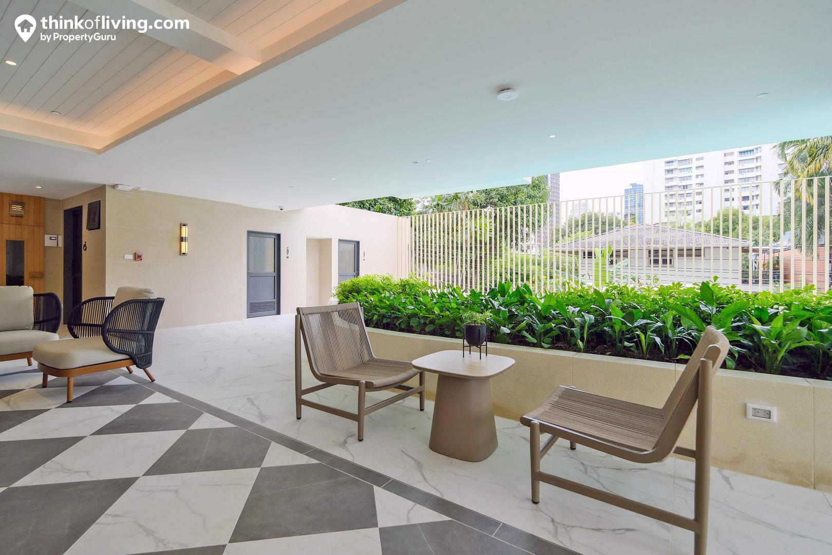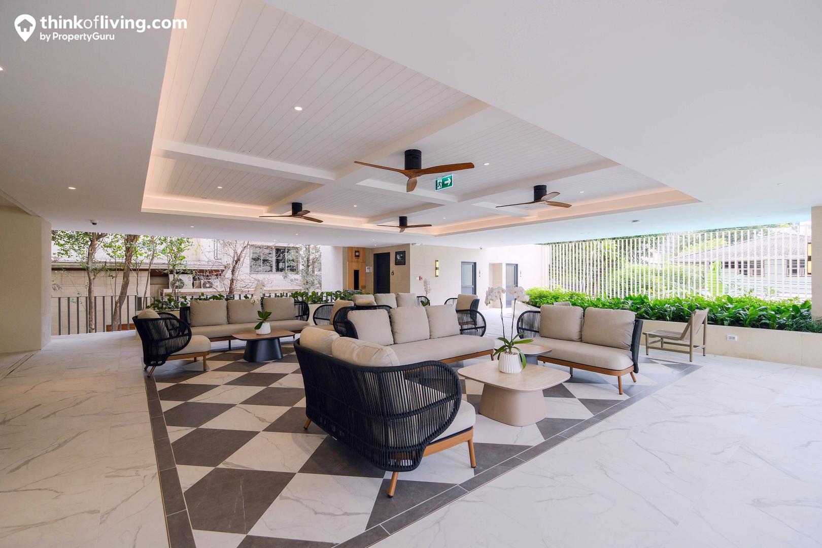 เข้ามาชมบรรยากาศจริงภายในโครงการ เมื่อขึ้นบันไดมาจะเจอกับ Veranda Lobby ได้ฟังก์ชันแบบ Semi Outdoor สามารถมานั่งเล่น ใช้งานได้ตลอดทั้งวัน โดยโครงการจัดชุดโซฟามาให้หลายจุด ใช้เป็นส่วนรับรองแขกก็ได้ ด้านข้างเชื่อมต่อกับสระว่ายน้ำและสวน จัดเป็นวิวที่ช่วยเพิ่มความร่มรื่น