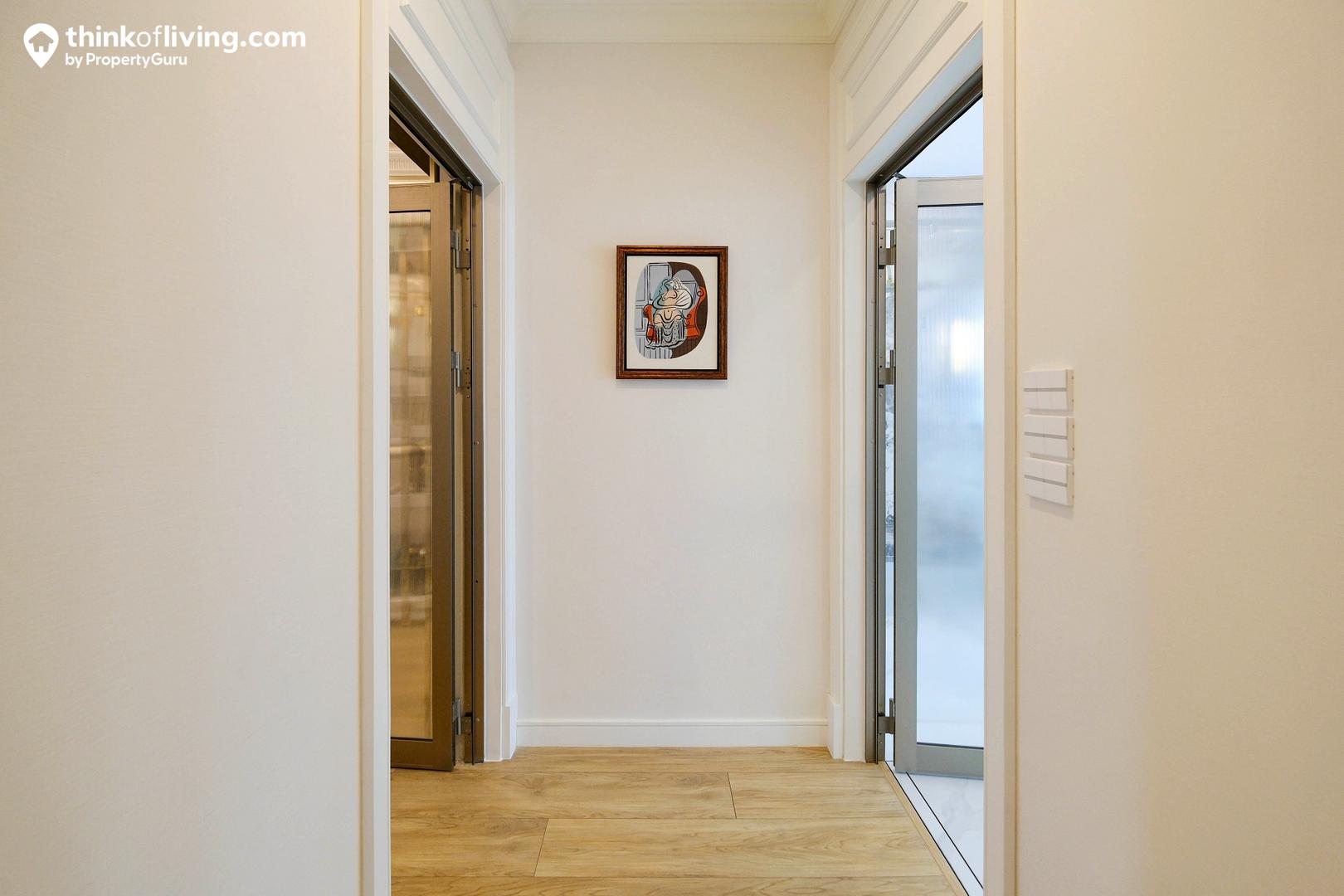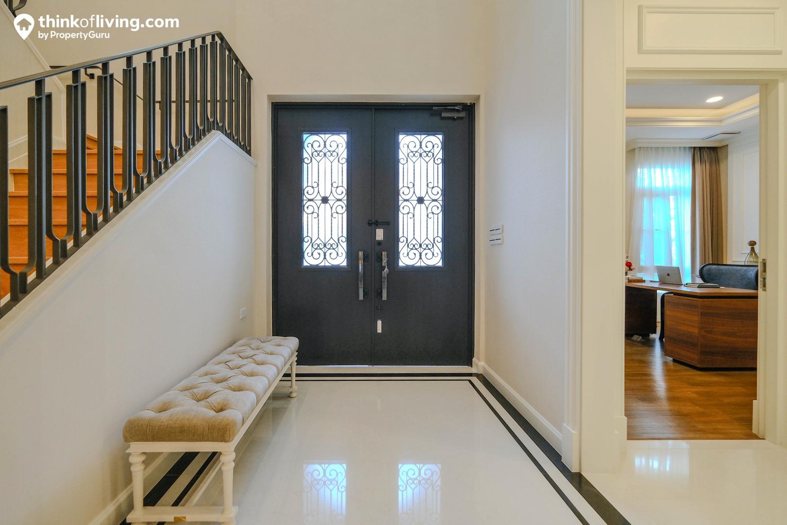 เข้ามาในตัวบ้านเป็นโถงต้อนรับขนาดใหญ่ได้เป็น Double Volume ประตูทางเข้าเป็นบานเปิดคู่ ติดตั้งมาให้พร้อม Digital Door Lock ด้านข้างมีบาน Fix กระจกมาให้ทั้ง 2 ฝั่ง ช่วยเพิ่มความโปร่งโล่ง