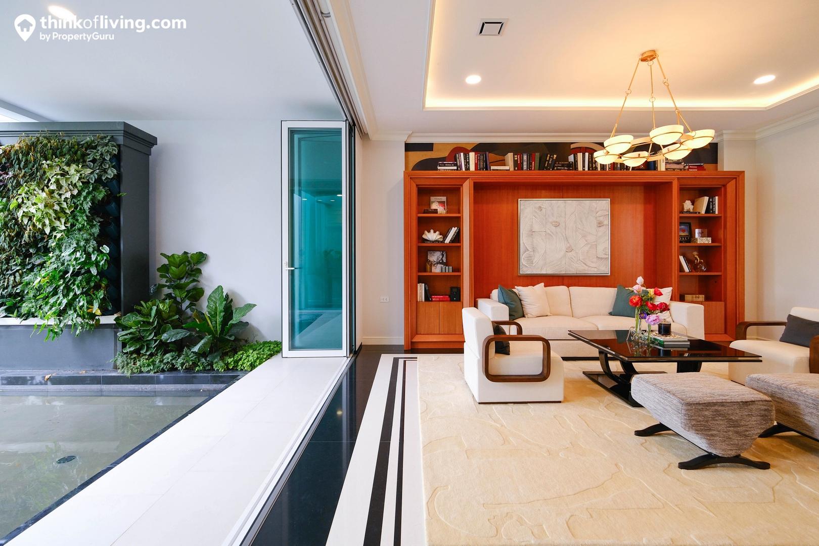 Guest Lounge อยู่ติดกับ Foyer เป็นโซนรับรองแขกของบ้าน แยกจากส่วนนั่งเล่น ได้ความเป็นส่วนตัว ด้านข้างได้เป็นประตูบานเฟี้ยมกระจกสูงถึงฝ้า เปิดรับวิวธรรมชาติได้ 180 องศา เดินออกไปยังเป็นเฉลียงให้วางเก้าอี้พักผ่อน เชื่อมต่อโซน Indoor – Outdoor ได้