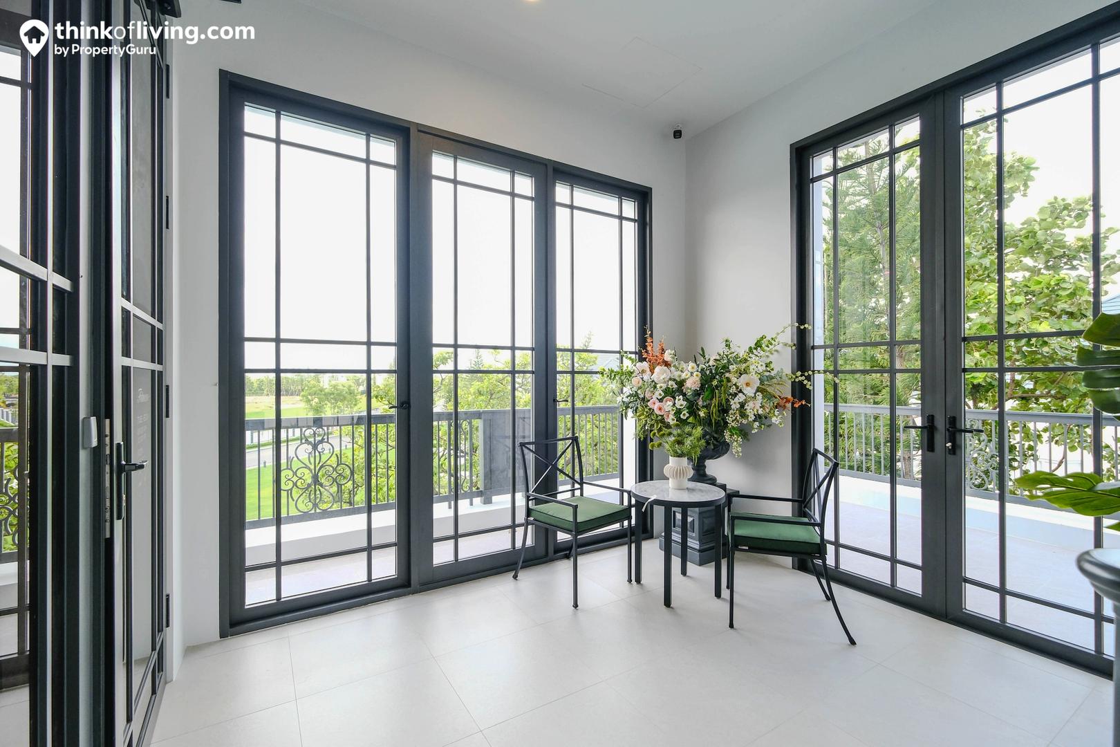 ห้องน้ำใน Grand Master Bedroom ได้บรรยากาศ Grand สมชื่อ ทั้งขนาดที่ได้มากว้างขวาง ดูโปร่งโล่ง แตกต่างจากห้องน้ำทั่วไป เปิดประตูเข้ามาจะเจอกับอ่างอาบน้ำตรงกลาง มีหน้าต่างกระจกและระเบียงที่ลงต้นไม้มาให้ ด้านบนเป็นช่องเปิดรับแสงธรรมชาติ อ่างล้างมือได้แยกเป็น 2 ฝั่งพร้อมตู้เก็บของด้านล่าง ส่วนอาบน้ำและพื้นที่วางโถสุขภัณฑ์ได้ Shower Box กั้นแยกเป็นสัดส่วน ใช้งานพร้อมกันได้สบายๆ