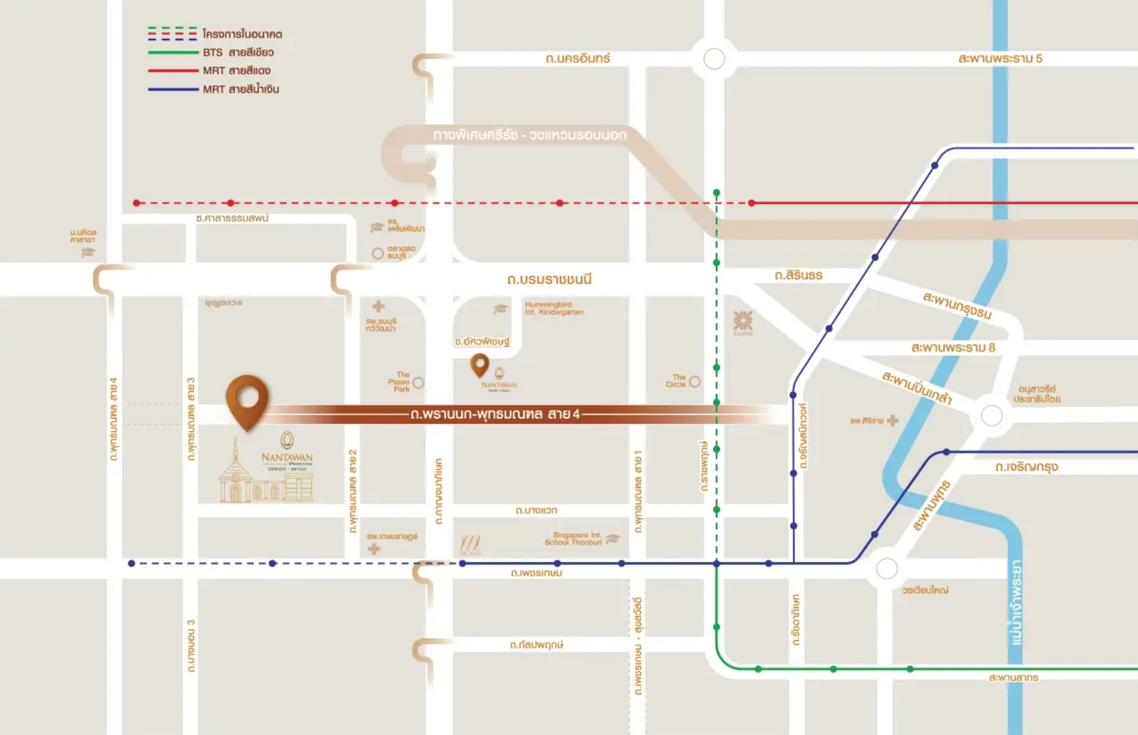 แผนที่จากทางโครงการ แสดงตำแหน่งของ NANTAWAN PRESTIGE ราชพฤกษ์ – พรานนก ที่ตั้งอยู่บนถนนพรานนก – พุทธมณฑล สาย 4 หรือมีชื่อเล่นของคนในพื้นที่ว่า “ถนนพระเทพ” โดยถนนเส้นนี้เป็นถนนตัดใหม่เชื่อมต่อระหว่างโซนปิ่นเกล้า – พุทธมณฑล โครงการจะอยู่ระหว่างถนนพุทธมณฑลสาย 2 และสาย 3 ซึ่งเป็นทำเลที่ขับไปเชื่อมต่อกับถนนใหญ่ได้อีก 3 สาย ทั้งถนนบรมราชชนนี , ถนนกาญจนาภิเษก และถนนเพชรเกษม เดินทางเข้า – ออกเมืองได้สะดวก โดยเฉพาะคนที่ทำงานอยู่ในโซนปิ่นเกล้า – จรัญฯ ก็สามารถขับรถตรงยาวๆไปถึงโรงพยาบาลศิริราชได้เลย นอกจากนี้โครงการยังอยู่ใกล้จุดขึ้น – ลงทางพิเศษศรีรัช วิ่งเข้าเมืองไปจตุจักรได้ง่าย หรือใครอยากใช้บริการรถไฟฟ้า โครงการก็อยู่ห่างจาก MRT หลักสองประมาณ 9 กิโลเมตร ถือเป็นอีกตัวเลือกในการเดินทาง