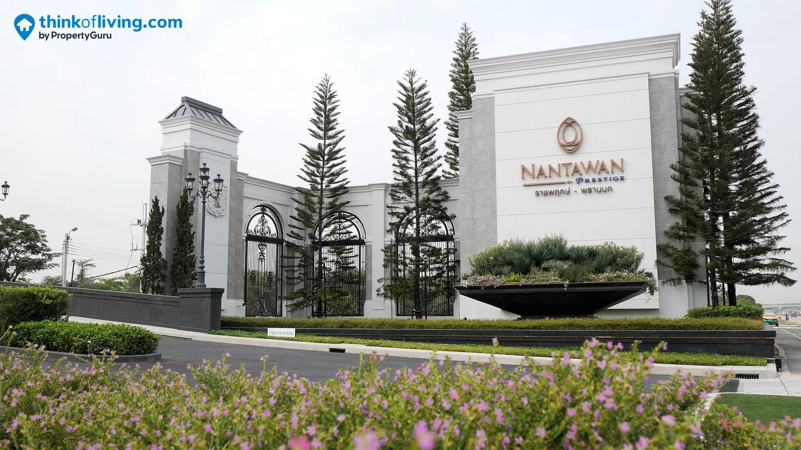 บรรยากาศซุ้มประตูของโครงการ จากถนนพรานนก – พุทธมณฑล สาย 4 จะเจอทางเข้า – ออกจุดแรก แยกทางสัญจรเป็น 2 ฝั่งชัดเจน มีป้ายโครงการอยู่ด้านหน้า เมื่อขับเข้ามาจะต้องผ่านสะพานข้ามคลองบางเชือกหนัง เข้ามาเจอกับวงเวียนน้ำพุขนาดใหญ่ ซึ่งอนาคตจะเป็นถนนที่ใช้ร่วมกับโครงการเพื่อนบ้าน โดยทางเข้า – ออกโครงการ NANTAWAN PRESTIGE ราชพฤกษ์ – พรานนก จะอยู่ทางซ้ายมือ แยก Main Gate กันชัดเจน