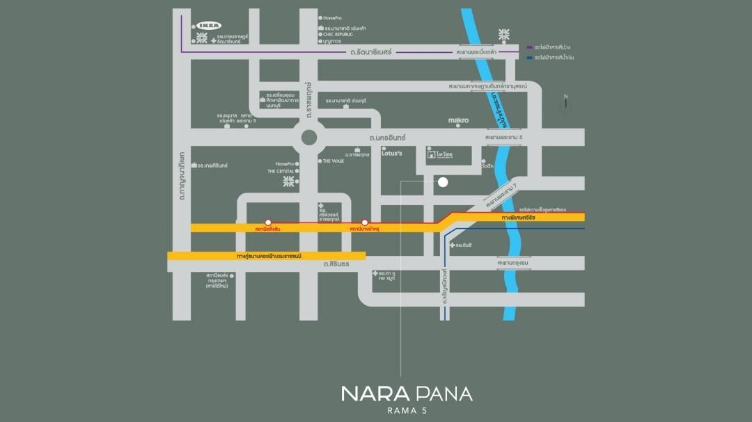 แผนที่โครงการ NARA PANA Rama 5 (นารา พนา พระราม 5) ตั้งอยู่บนถนนโยธาธิการ นนทบุรี ใกล้ถนนราชพฤกษ์ และถนนกาญจนาภิเษก รวมถึงไม่ไกลจากรถไฟฟ้า 3 สาย ได้แก่ สายสีแดง สีม่วง และสีน้ำเงิน รายล้อมด้วยสิ่งอำนวยความสะดวกครบ ทั้งศูนย์การค้า สถานศึกษา และโรงพยาบาลชั้นนำ