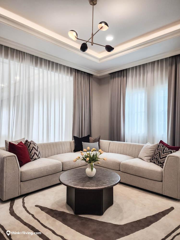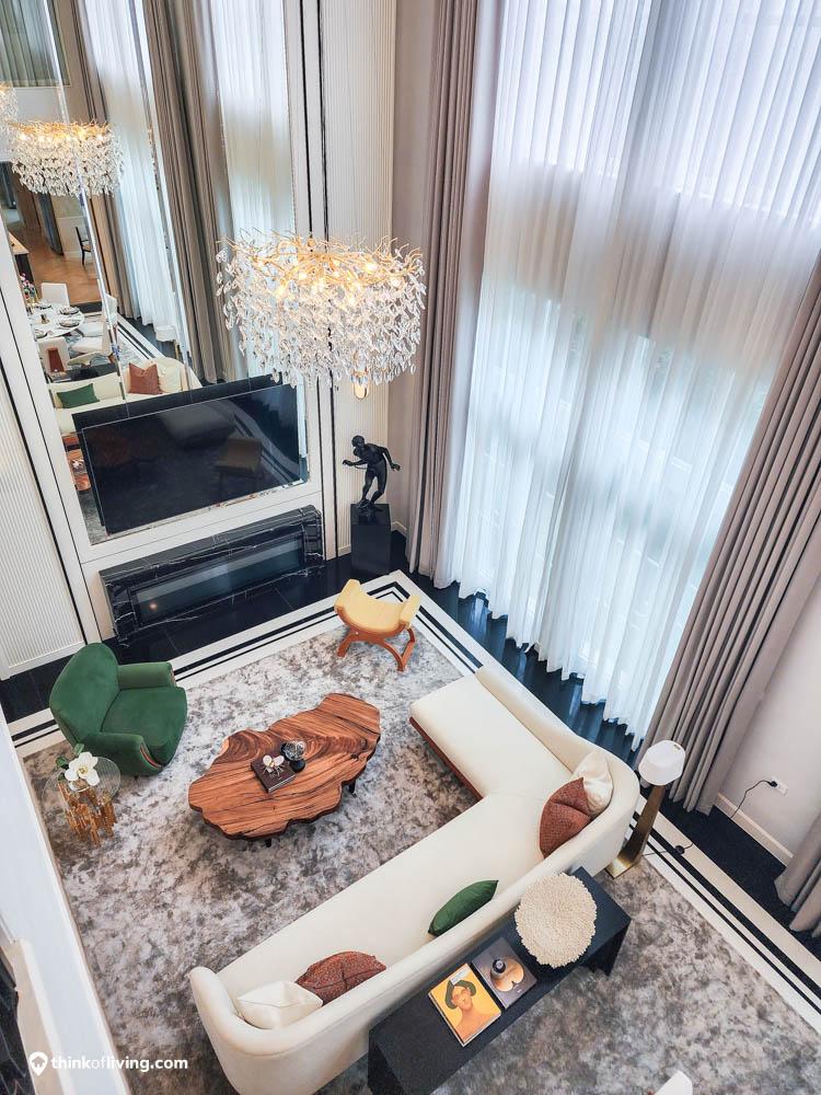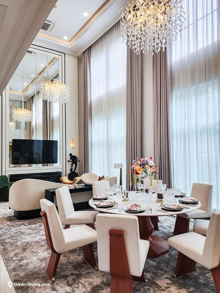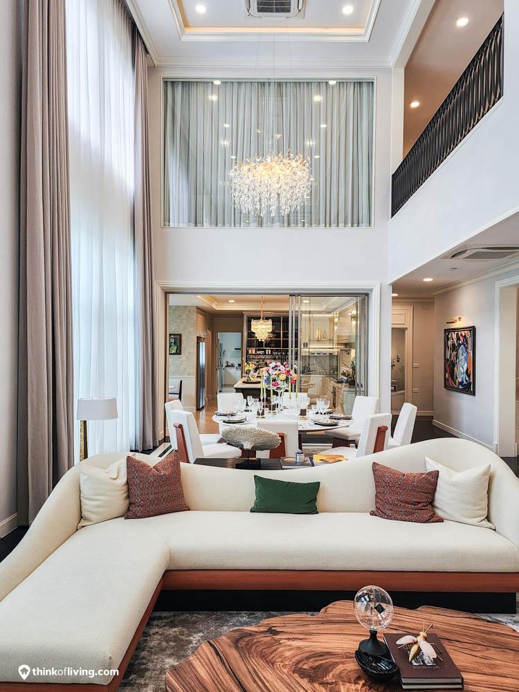 บ้านออกแบบมาในโทนสีขาว ดูหรูหรา ออกแบบมาหน้ากว้าง ทำให้บ้านดูมีขนาดใหญ่ ภายในบ้านดูโปร่งโล่ง โดยเฉพาะโซน Dining Living ที่จัดมาเป็น Double Volume ตรงนี้ดูหรูหราเอามากๆ นั่งได้ยาวๆ