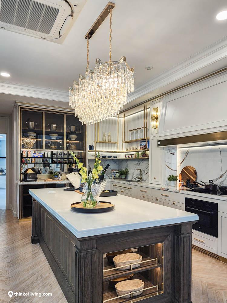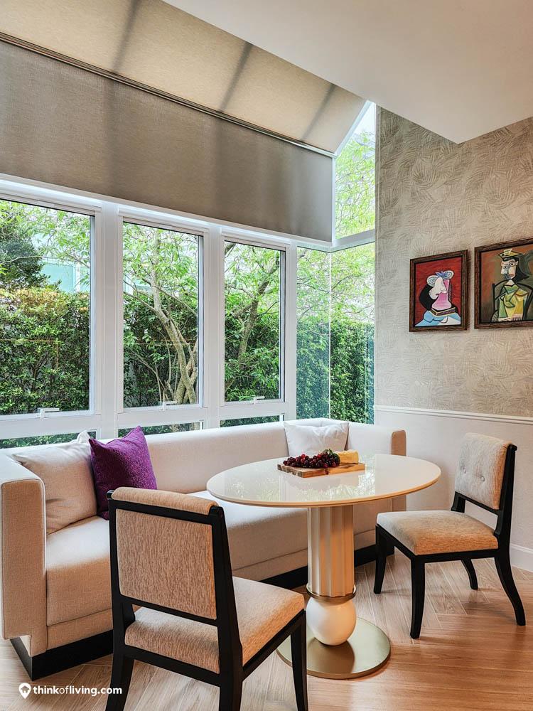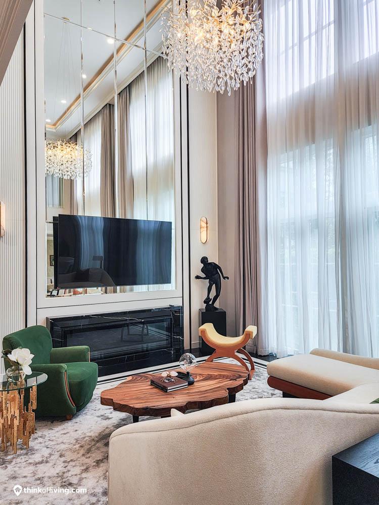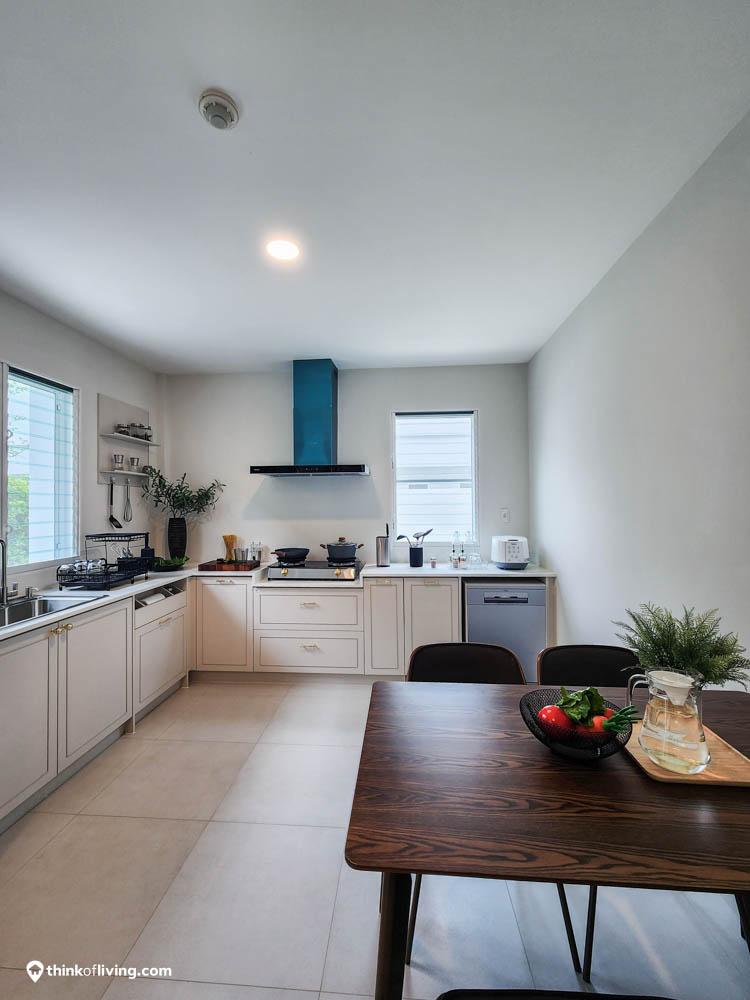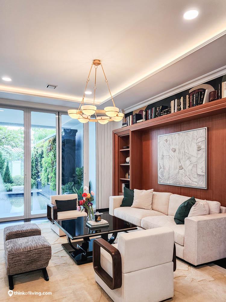 บ้านออกแบบมาในโทนสีขาว ดูหรูหรา ออกแบบมาหน้ากว้าง ทำให้บ้านดูมีขนาดใหญ่ ภายในบ้านดูโปร่งโล่ง โดยเฉพาะโซน Dining Living ที่จัดมาเป็น Double Volume ตรงนี้ดูหรูหราเอามากๆ นั่งได้ยาวๆ