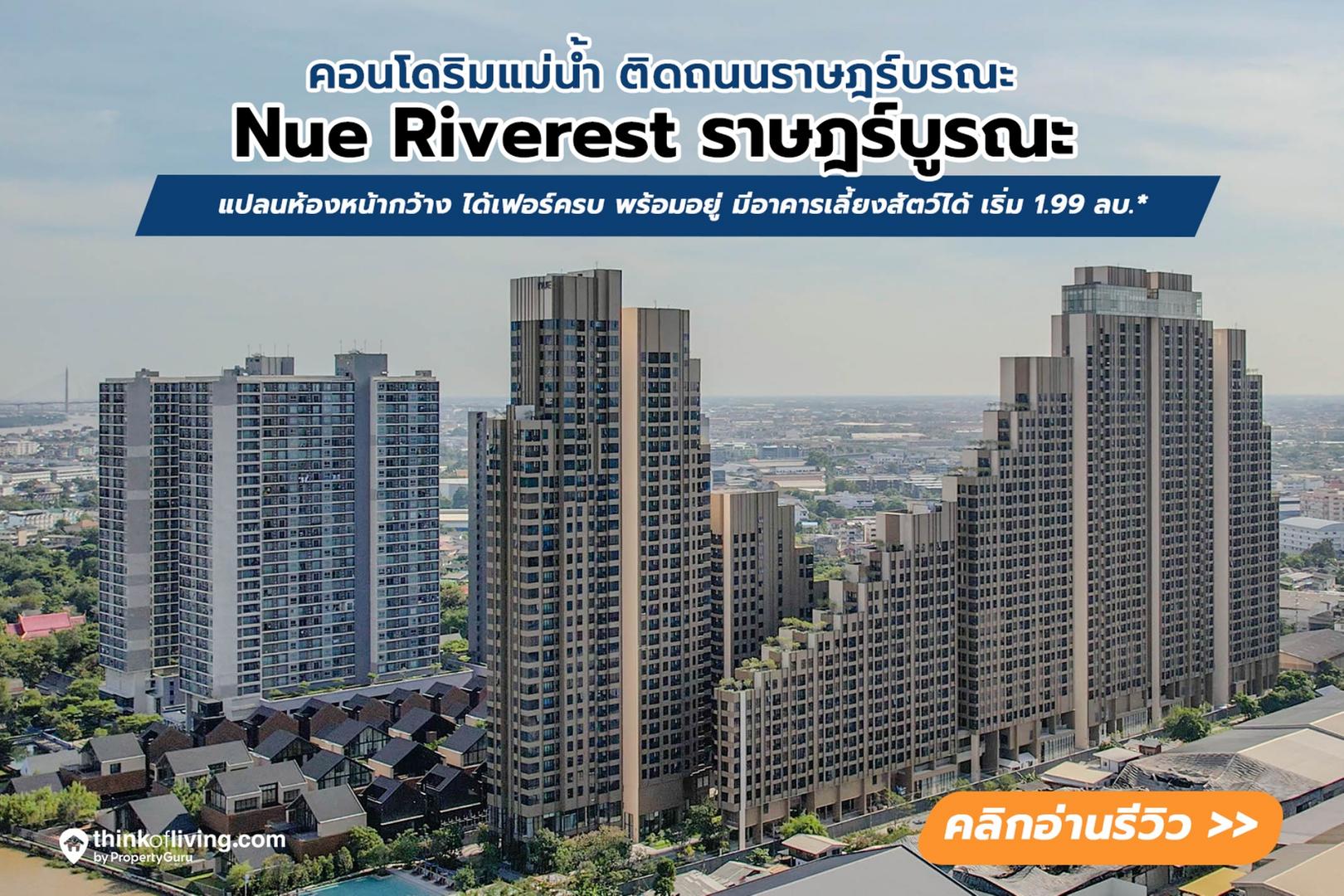 รีวิววันนี้พามาชมคอนโดพร้อมอยู่ ริมแม่น้ำ ในราคาเริ่มต้นไม่ถึง 2 ล้านบาท..! กับโครงการ Nue Riverest Ratburana (นิว ริเวอร์เรสต์ ราษฎร์บูรณะ) คอนโด High – Mid Rise บนถนนราษฎร์บูรณะ ฝั่งนึงติดถนนใหญ่ อีกฝั่งติดริมแม่น้ำ ได้เฟอร์ครบ พร้อมเข้าอยู่ในราคาเริ่มต้น 1.99 ล้านบาท* รูปแบบห้องมีให้เลือกตั้งแต่ Studio ไปจนถึง 3 Bedroom เหมาะกับคนที่อยากได้ห้องไซส์กระทัดรัด ได้ราคาย่อมเยามาพร้อมวิวแม่น้ำแบบโปร่งโล่ง ซึ่งโครงการนี้ก็ถือว่าเป็น Rare Item ในย่านเลยนะคะ โดย Highlights ที่น่าสนใจจะมีอะไรบ้าง ไปชมกันค่ะ