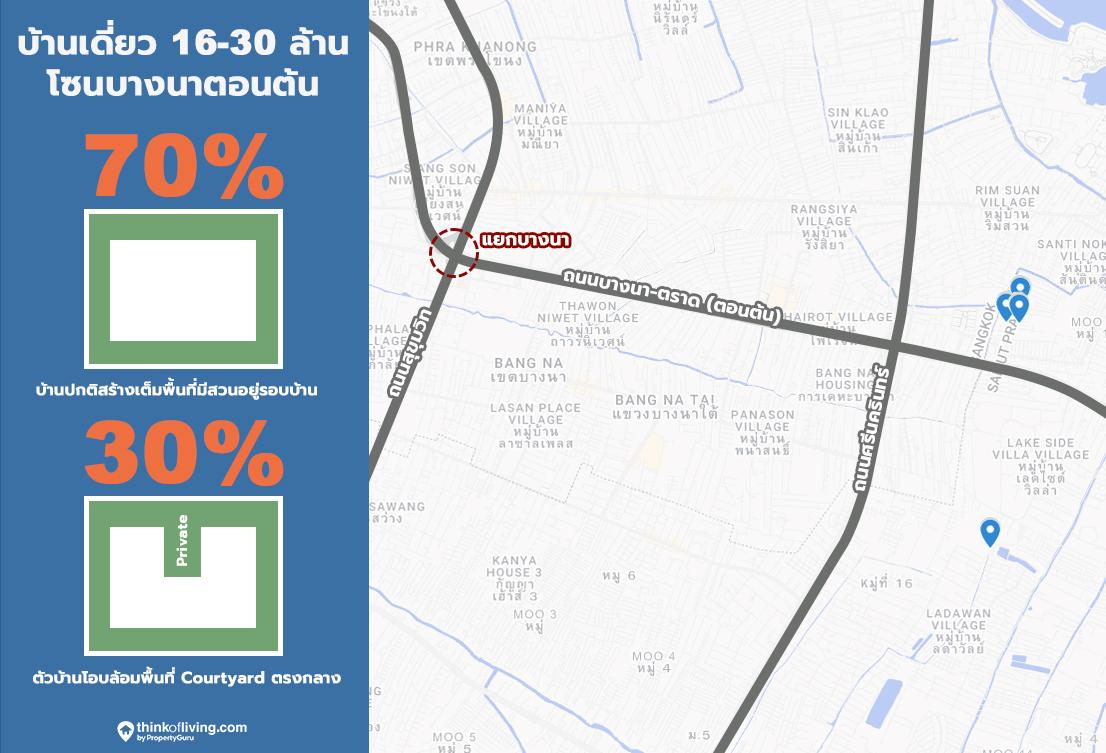 อย่างล่าสุดเราไปสำรวจกลุ่มบ้านเดี่ยว 16-30 ล้าน บนทำเลบางนาตอนต้น (ช่วงตั้งแต่แยกบางนา ถึงช่วงที่ตัดกับถนนศรีครินทร์) พบว่าส่วนใหญ่ 70% เป็นบ้านทรงสี่เหลี่ยมผืนผ้าที่มีสวนรอบบ้าน แต่จะมีแค่ 30% ที่ตัวบ้านออกแบบ Courtyard ไว้ตรงกลาง และมีเพียง 20% ที่วางตำแหน่ง Courtyard ไว้ด้านใน ทำให้ได้ความเป็นส่วนตัวสูงสุด เพราะตัวบ้านจะโอบล้อม Courtyard ไว้ช่วยป้องกันสายตาจากเพื่อนข้างบ้านได้เป็นอย่างดี โครงการนั้นคือ Vivaldi Bangna นั่งเองค่ะ
